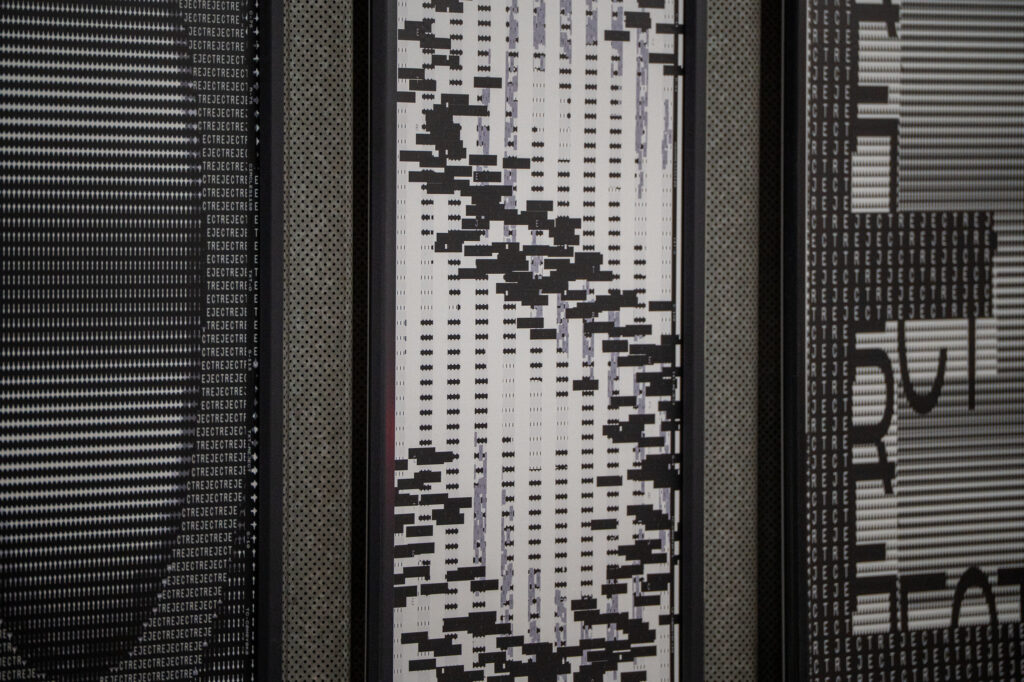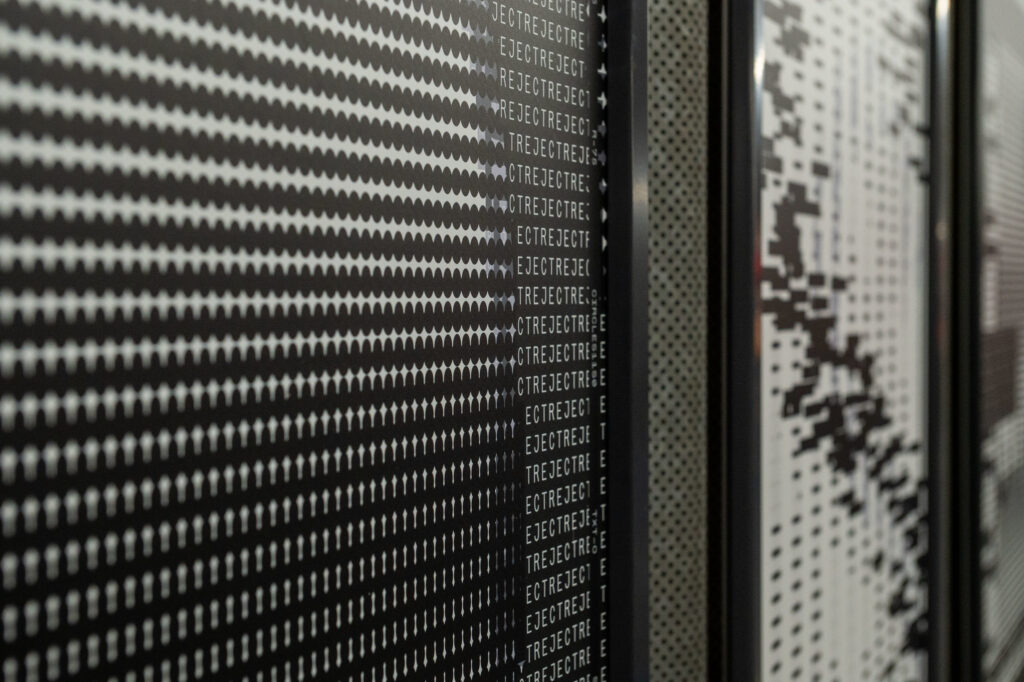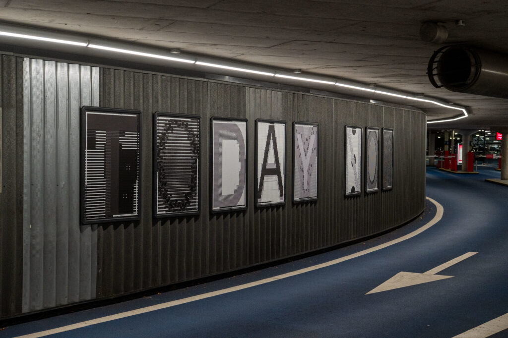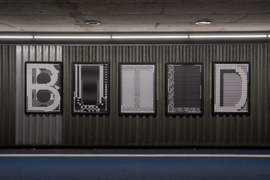 Studio Studio extended the contrast between speed and taking time into the composition of the posters. Each letter of the sentence “We choose light open near paths to build and give today now” is set large (macrotype) on a poster, while the opposite word is placed small (microtype) inside the letter. For example, the “W” in “We” is made up of “They”, and the “C” in “Choose” is composed of “Reject.”