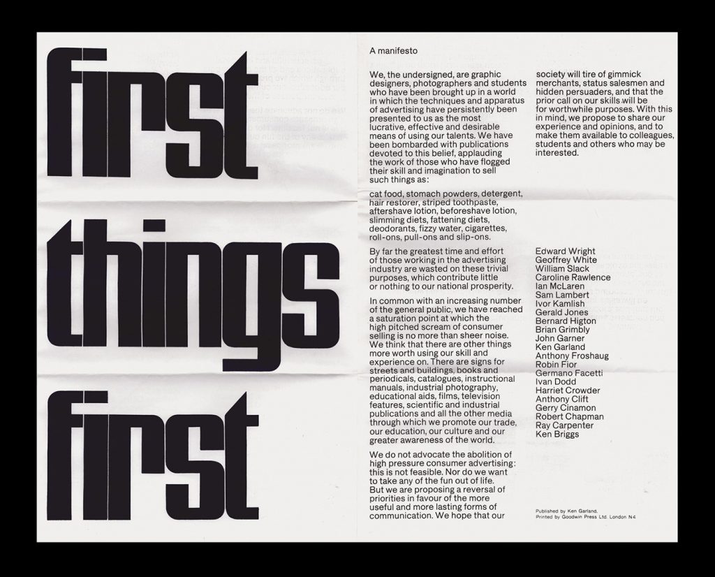 In 1964 schreef Garland samen met een groep collega’s het beroemde First Things First Manifesto. Daarin riepen zij ontwerpers op om hun talent niet alleen te gebruiken voor reclame en consumptie, maar ook voor zaken die écht belangrijk zijn: onderwijs, cultuur, publieke informatie en sociale verandering.