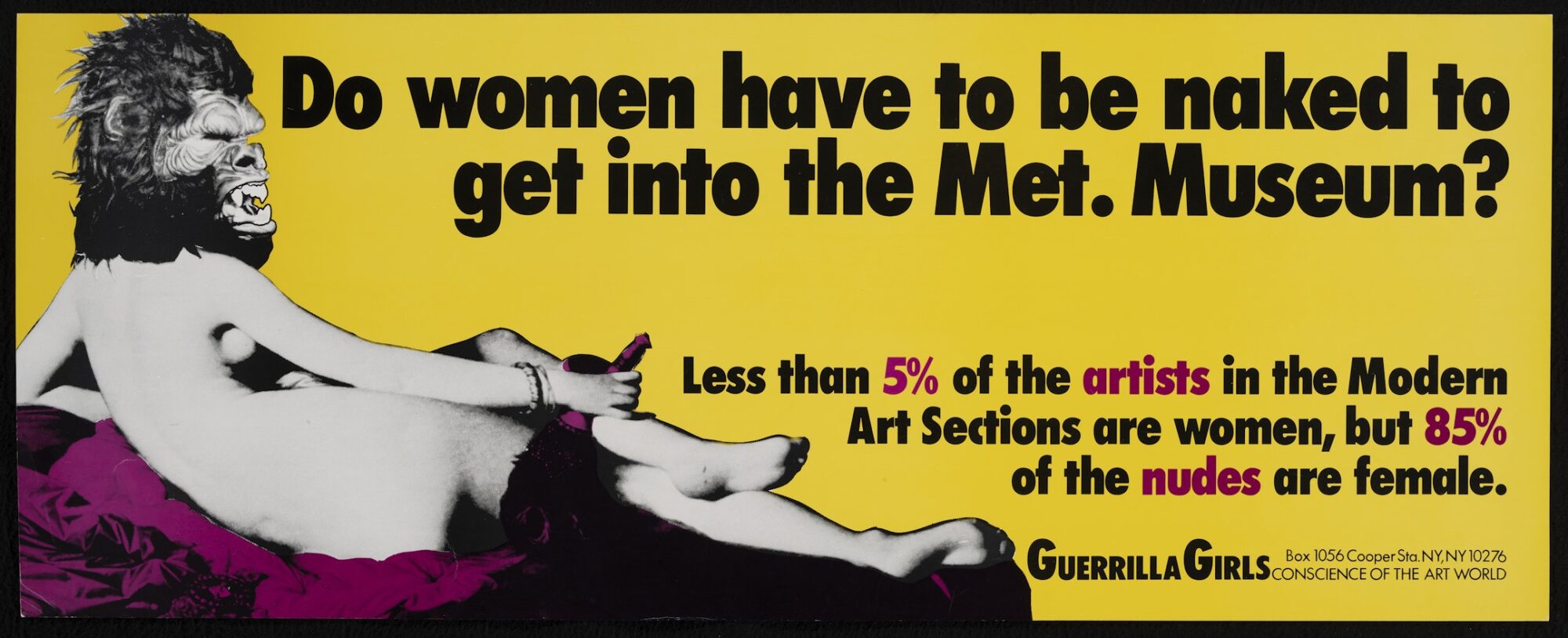 Guerrilla Girls is een anonieme groep feministische kunstenaars die sinds 1985 strijdt tegen ongelijkheid in de kunstwereld en de maatschappij. Ze dragen gorillamaskers om hun identiteit geheim te houden en gebruiken humor, felle beelden en scherpe statistieken om ongelijkheid zichtbaar te maken.